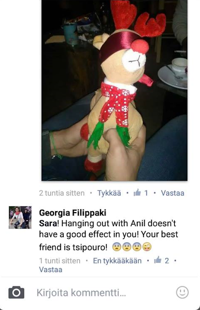 Joskus joulun alla olin kakkoskämpän porukallani - minä, Anil ja silloiset lyhytaikaiset vapaaehtoiset - meidän vakkarimestassa eli Spitakissa tappamassa tsipouroa. Laitoin meidän kämpän Facebook-ryhmään pöhköjä kuvia Spitakissa olleesta Petteri Punakuono -pehmolelusta. Sain Georgialta toruja.